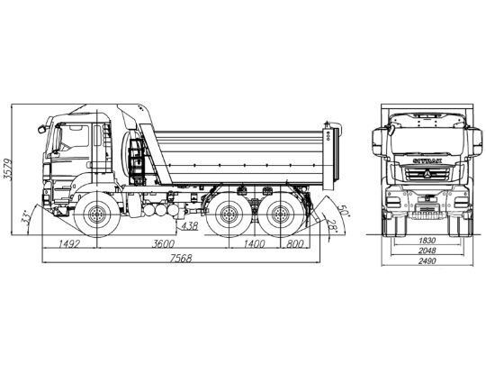 КУЗОВ Объем 16 м3 Материал кузова износостойкая сталь Hardox 400 или аналог, пол 8 мм, борта 5 мм Обогрев днища и нижней части боковых бортов выхлопными газами Крепление запасного колеса с лебедкой на передней стенке кузова Автоматические замки заднего борта, тент, лестница