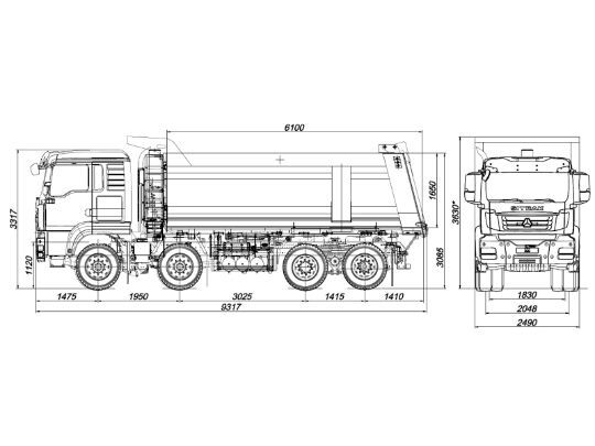 ОСНОВНЫЕ ДАННЫЕ* Объем кузова, куб.м - 22 Cнаряженная масса, кг - 18 500 Грузоподъемность - 31 500** Полная масса, кг - до 50 000** Нагрузка на передние оси, кг - 19 000** Нагрузка на заднюю тележку, кг - 32 000**